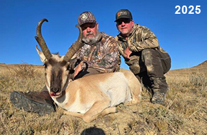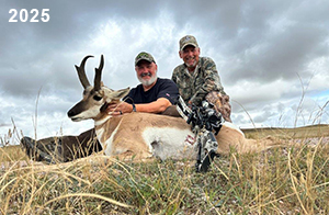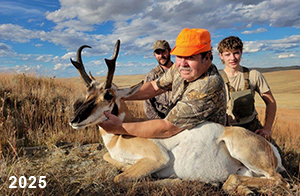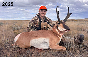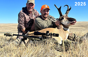 Antelope We also offer straight antelope hunts with both bow and rifle. Our success on both the bow and rifle is over 95% opportunity. All antelope hunts are guided 3x1 or 2x1. 1x1 guided hunts are available for an additional fee. We offer hunts in many areas that take 0-8 Antelope Preference points. These hunts offer a hunter opportunity at quality antelope. These hunts are offered from our lodge or motel. Our bow hunts are offered August 15-17. The method we use for hunting the antelope with a bow are blinds, set up over water holes. Bow hunters have excellent chances at Pope and Young quality antelope. Our rifle antelope hunts are hunted from October through the early November. In our 2025 season we took 3 antelope archery hunters who all were able to harvest their pronghorn buck. We hunted 22 antelope-only rifle hunters, all 22 were successful in harvesting their buck. An additional 15 combination hunters harvested 15 antelope bucks. During the 2024 season we hunted 5 antelope archery hunters and harvested 3 bucks; 100% shooting. We took 14 antelope-only rifle hunters and all 14 harvested their antelope buck. An additional 16 antelope hunters combined their antelope hunt with deer, bull elk, and cow elk. These combo hunters harvested 11 antelope bucks. In our 2023 season we hunted 7 antelope archery hunters and harvested 5 bucks. We took 33 antelope rifle hunters and harvested 31 bucks. We had 100% opportunity. During the 2022 season we hunted 9 antelope archery hunters and harvested 5 bucks. We took 32 antelope rifle hunters and harvested 28, with 100% opportunity. In the 2021 season we hunted 2 antelope archery hunters and harvested 2 bucks. We had 36 rifle hunters and harvested 33, with 100% opportunity. During the 2020 season we hunted 5 antelope archery hunters and harvested 5 bucks. In September and October, we hunted 32 rifle hunters and harvested 31 bucks, with 100% opportunity. In the 2019 season we hunted 7 archery hunters and harvested 6 bucks. We hunted 26 rifle hunters and harvested 26 antelope bucks. During the 2018 season we hunted 15 antelope bow hunters and harvested 8 bucks. We hunted 24 antelope rifle hunters and all harvested mature antelope bucks. |