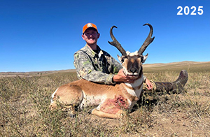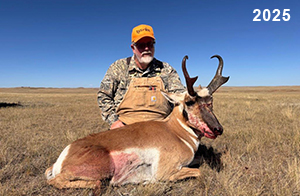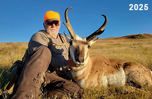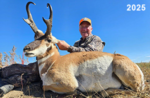 Antelope We also offer straight antelope hunts with both bow and rifle. Our success on both the bow and rifle is over 95% opportunity. All antelope hunts are guided 3x1 or 2x1. 1x1 guided hunts are available for an additional fee. We offer hunts in many areas that take 0-8 Antelope Preference points. These hunts offer a hunter opportunity at quality antelope. These hunts are offered from our lodge or motel. Our bow hunts are offered August 15-17. The method we use for hunting the antelope with a bow are blinds, set up over water holes. Bow hunters have excellent chances at Pope and Young quality antelope. Our rifle antelope hunts are hunted from October through the early November. In our 2025 season we took 3 antelope archery hunters who all were able to harvest their pronghorn buck. We hunted 22 antelope-only rifle hunters, all 22 were successful in harvesting their buck. An additional 15 combination hunters harvested 15 antelope bucks. During the 2024 season we hunted 5 antelope archery hunters and harvested 3 bucks; 100% shooting. We took 14 antelope-only rifle hunters and all 14 harvested their antelope buck. An additional 16 antelope hunters combined their antelope hunt with deer, bull elk, and cow elk. These combo hunters harvested 11 antelope bucks. In our 2023 season we hunted 7 antelope archery hunters and harvested 5 bucks. We took 33 antelope rifle hunters and harvested 31 bucks. We had 100% opportunity. During the 2022 season we hunted 9 antelope archery hunters and harvested 5 bucks. We took 32 antelope rifle hunters and harvested 28, with 100% opportunity. In the 2021 season we hunted 2 antelope archery hunters and harvested 2 bucks. We had 36 rifle hunters and harvested 33, with 100% opportunity. During the 2020 season we hunted 5 antelope archery hunters and harvested 5 bucks. In September and October, we hunted 32 rifle hunters and harvested 31 bucks, with 100% opportunity. In the 2019 season we hunted 7 archery hunters and harvested 6 bucks. We hunted 26 rifle hunters and harvested 26 antelope bucks. During the 2018 season we hunted 15 antelope bow hunters and harvested 8 bucks. We hunted 24 antelope rifle hunters and all harvested mature antelope bucks. |